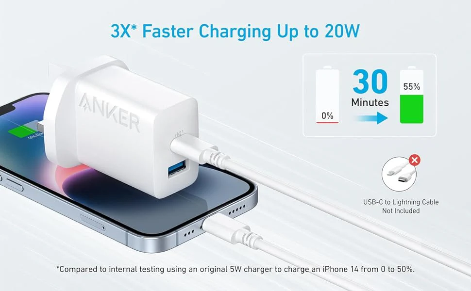 Anker 20W Wall Charger with Type-C and USB Ports and Type-C Cable 1.5 meter, 2 Port High Speed Charger, ActiveShield protection, B2348K21SC, White