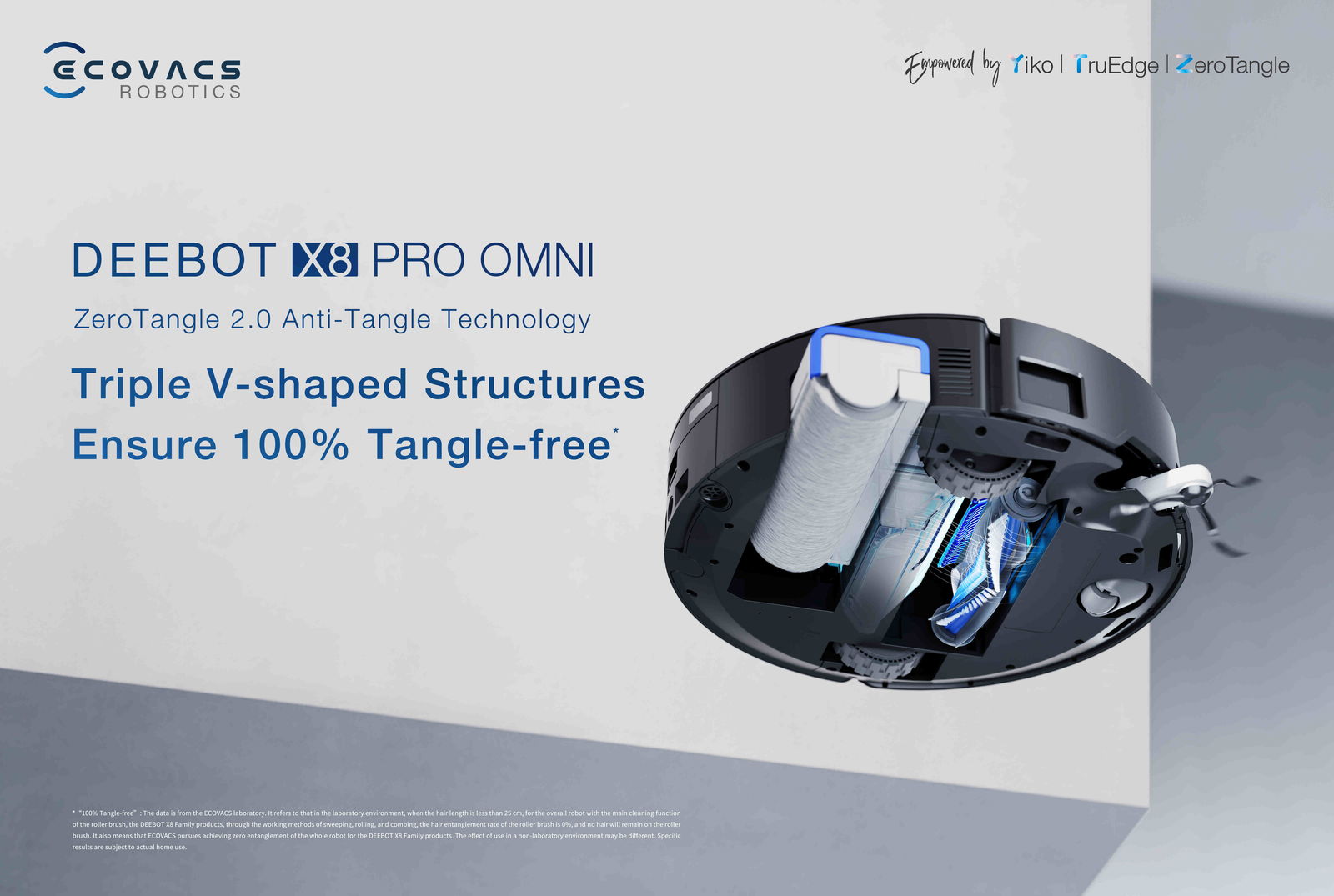 The DEEBOT X8 comes with the outstanding ZeroTangle 2.0 featuring 3V Anti-Tangle Technology. The 45° V-shaped angle bristle design cleverly prevents hair from getting stuck deep in the bristle gaps. The V-shaped spiral brush collects hair in the middle, and the V-shaped comb teeth array smoothly untangles it. Enjoy efficient suction, easy maintenance, and flawlessly clean floors with the DEEBOT X8