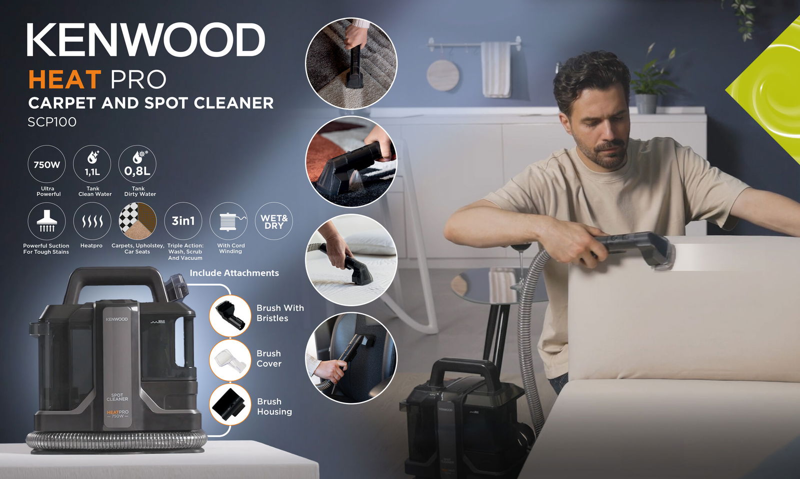 Kenwood Spot Clean Vacuum cleaner Heatpro, 750W, 1.1L, Triple action Washes, Scrubs and Vacuums, for Carpet and Upholstery, SCP100, Black