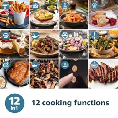 Air fry, bake, grill, roast and more. Easily adjust time and temperature for 12 different ways of cooking including quick reheating, defrosting and dehydrating.
