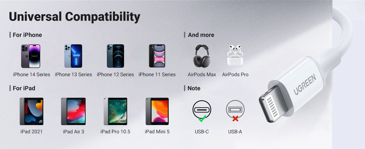 Ugreen Charging and Sync Data Cable USB-C to Lightning 1m, 60W, Charge 2x Faster with MFi, Rapid 3A PD Charge, 10493, White