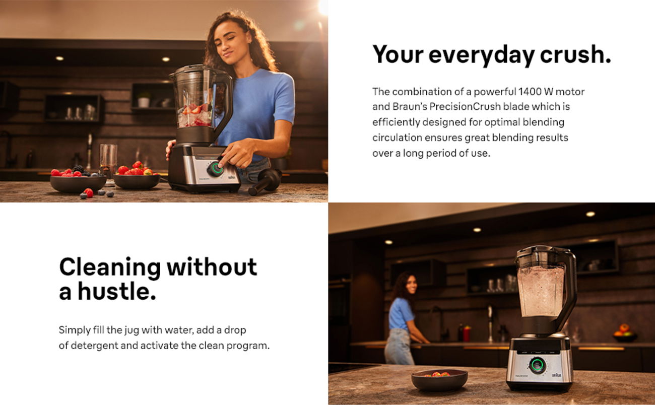 خلاط كهربائي من براون 7، 1400 واط، 10 سرعات، 9 برامج طعام، برنامج سموذي، سعة 1.7 لتر، تقنية TriAction، 10 سرعات، وظيفة النبض، شفرة PrecisionCrush، برنامج التنظيف، JB7550BK، أسود