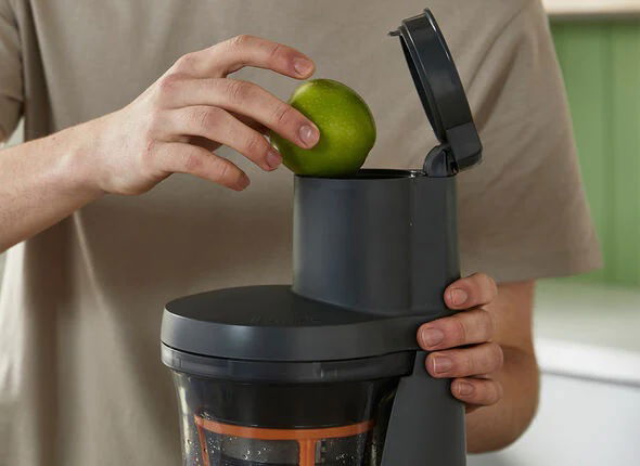 عصر أسرع بمقاسين من أنبوب التغذية ليناسب أحجام مختلفة من الفاكهة والخضروات يمكن فتح غطاء أنبوب التغذية العريض أثناء العصر لإضافة قطع أكبر من الفاكهة والخضروات. ستتوقف العصارة مؤقتًا عندما يكون الغطاء في وضع الفتح. أغلق الغطاء لإستئناف العصر.