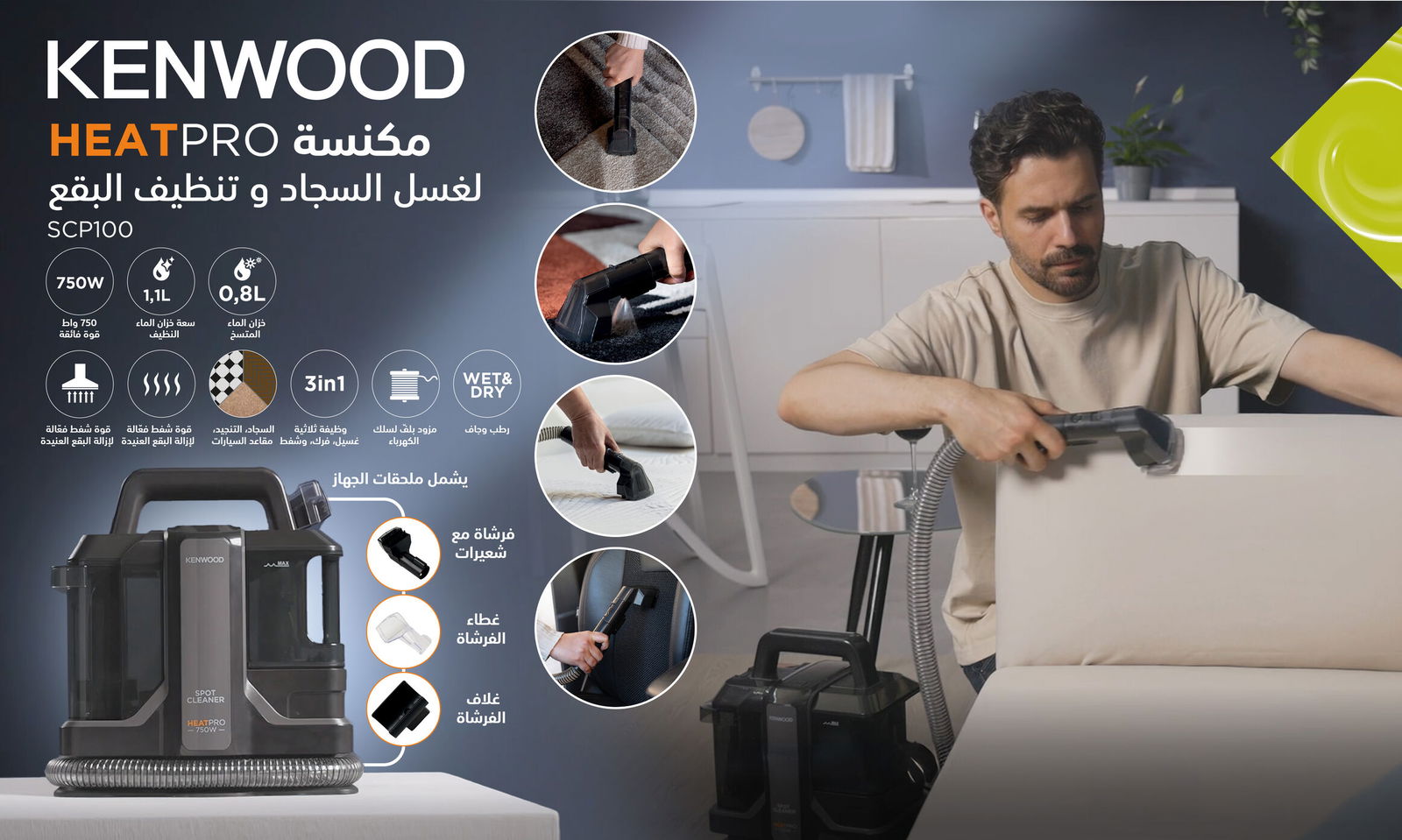مكنسة كهربائية كينوود سبوت كلين هيت برو، 750 واط، 1.1 لتر، تنظيف ثلاثي الوظائف: غسيل وفرك وشفط، للسجاد والمفروشات، SCP100، أسود
