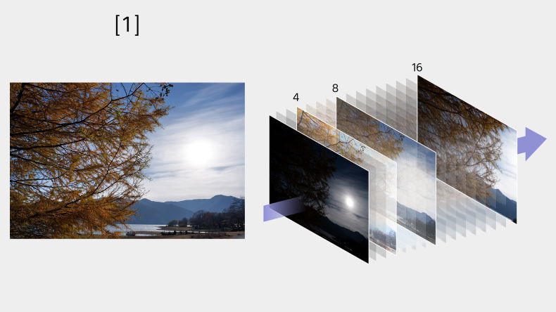 تتيح لك خاصية التصوير بصيغة RAW المركبة التقاط عدة صور RAW يمكن دمجها على جهاز الكمبيوتر. يُنتج إعداد [التصوير بتقنية تقليل التشويش] صورًا منخفضة التشويش مع الحفاظ على دقة عالية حتى في ظروف حساسية متوسطة إلى عالية. أما خاصية [التصوير بتقنية HDR] فتتيح التقاط صور بنطاق ديناميكي عالٍ، مع خيارات لالتقاط 4 أو 8 أو 16 صورة في وقت واحد بمعدل 30 إطارًا في الثانية.