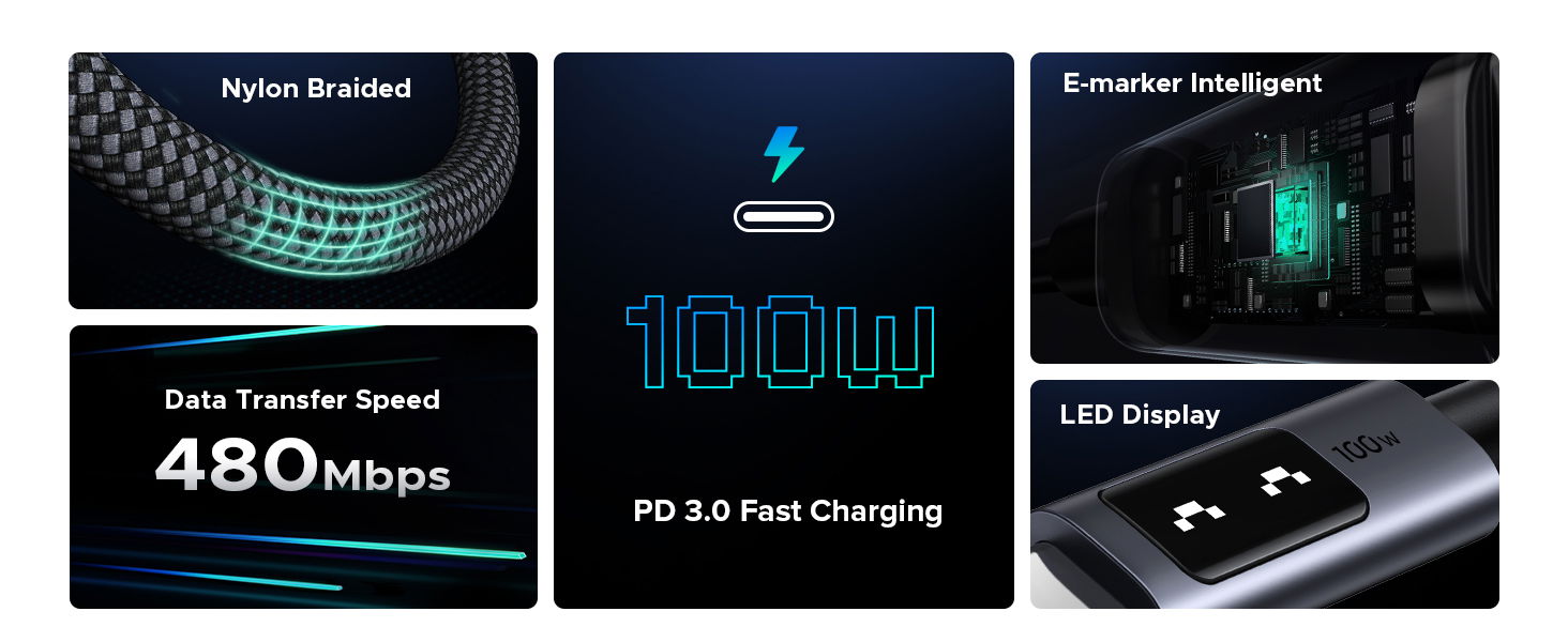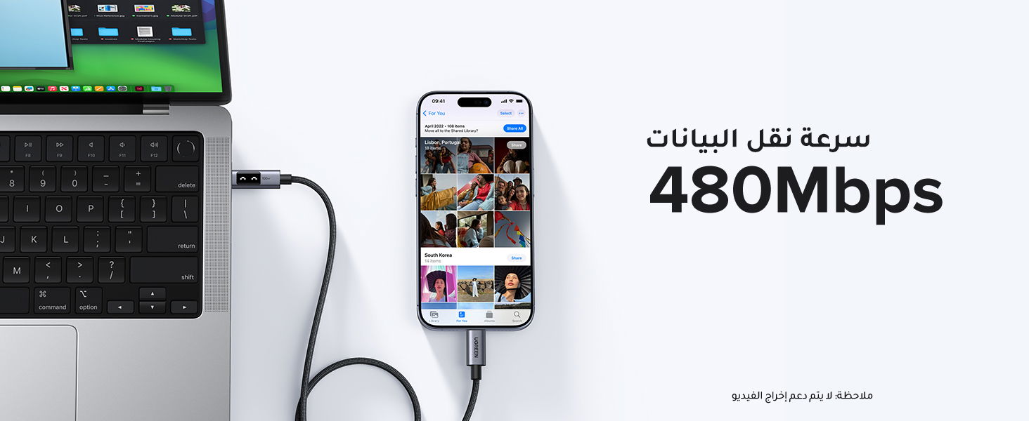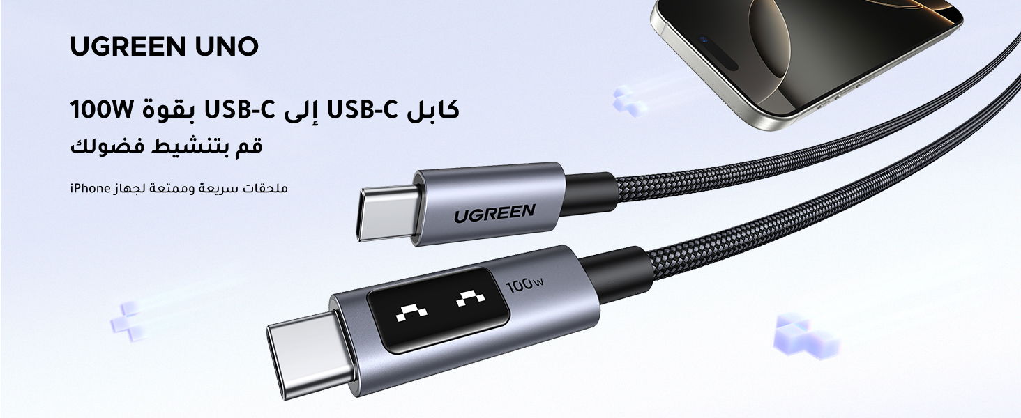 سلك شاحن يوجرين Uno من USB-C الى USB-C بطول 1 م وبقوة 100 واط، كابل شحن سريع من النوع C بقوة 5 أمبير، وسرعة نقل بيانات تصل إلى 480 ميجابت في الثانية، رقم الموديل 35501، لون أسود